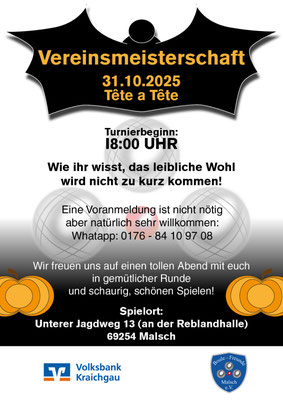 Am Abend der Nacht zum Gruseln war es wieder soweit und die Boule-Freunde Malsch suchten ihren Vereinsmeister im Eins gegen Eins. Kein leichtes Unterfangen, da die Möglichkeit das Verlieren oder bescheidene Abschneiden auf die Mitspieler zu schieben, nicht vorhanden ist.