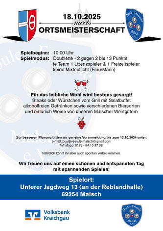 Wie bereits letztes Jahr meldeten sich 20 Teams zu den Ortsmeisterschaften im Doublette an. Etliche Teams mit einem Lizenz- und einem Freizeitspieler zogen ins Rennen, aber auch zur Freude der Boule-Freunde trauten sich einige Teams ohne oder mit wenig Erfahrung den Spaß am Spiel und stellten sich der Herausforderung.